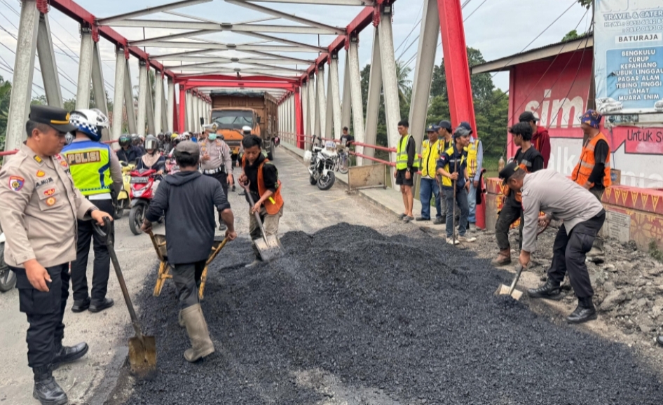 Kapolres OKI bersama unsur Kodim 0402, Dinas PUPR, Satpol PP, dan Dinas Kebersihan OKI melaksanakan penambalan jalan menggunakan aspal curah serta mesin pengeras aspal.